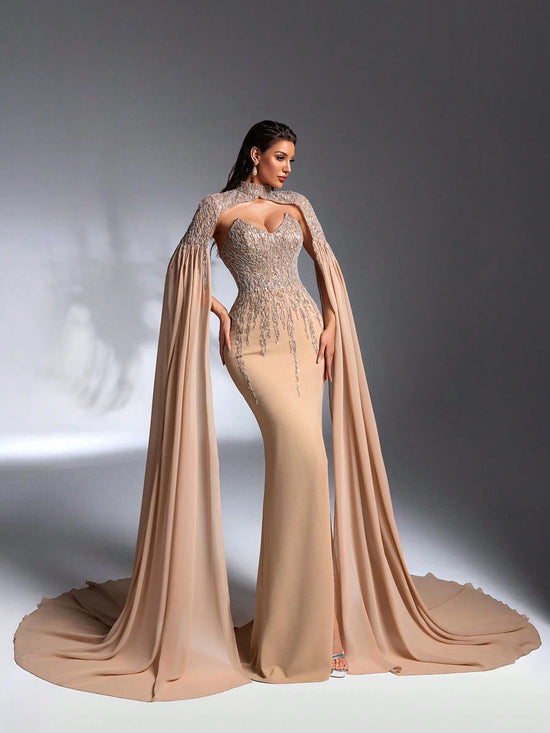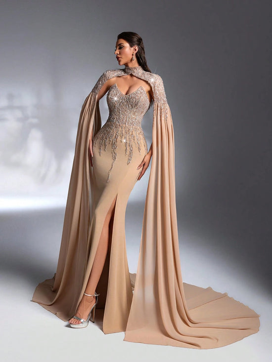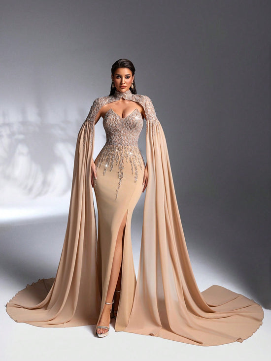 Cette robe dos nu fendue allie élégance et sophistication grâce à son col châle délicat et son patchwork raffiné de perles et de paillettes. Conçue pour des occasions prestigieuses telles que dîners de gala, mariages et événements cocktails, elle met en valeur votre silhouette tout en apportant une touche luxueuse à votre tenue. Parfaite pour celles qui recherchent un style audacieux sans sacrifier le raffinement.